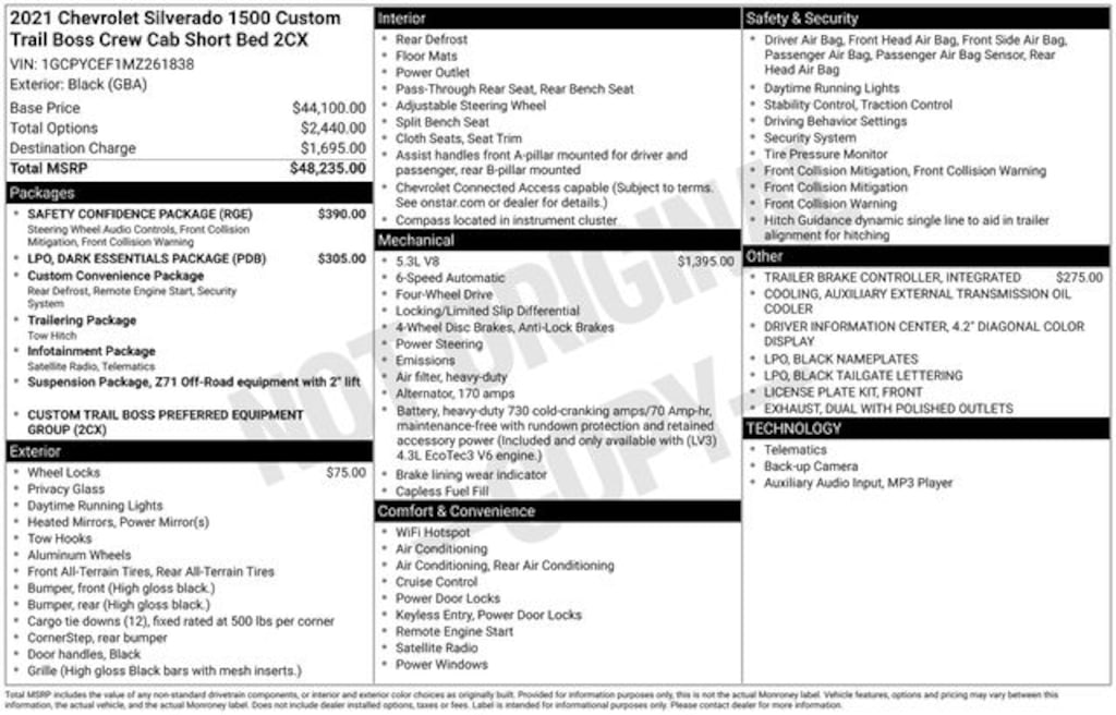 Key Chrysler Dodge Jeep Ram of Rochester is proud to present you with another True Market Priced Pre-Owned Vehicle. Transparent Pricing Of $ !! This 2021 Chevrolet Silverado 1500 Custom Trail Boss is loaded with the following Factory Options: 6-Speed Automatic Electronic with Overdrive, 4WD, and Black Cloth Custom Convenience Package (Electric Rear-Window Defogger, EZ Lift Power Lock & Release Tailgate, LED Cargo Area Lighting, Remote Vehicle Starter System, and Theft Deterrent System (Unauthorized Entry)), Dark Essentials Package (LPO) (Black Name Plates (LPO)), Infotainment Package (4G LTE Wi-Fi Hot Spot Capable, Chevrolet Connected Access Capable, OnStar & Chevrolet Connected Services Capable, and SiriusXM Radio), Preferred Equipment Group 2CX (170 Amp Alternator, 3.5" Diagonal Monochromatic Display, Auto-Locking Rear Differential, Bluetooth® For Phone, Color-Keyed Carpeting Floor Covering, Compass, Deep-Tinted Glass, Electronic Cruise Control, Front Rubberized Vinyl Floor Mats, High Gloss Black Grille, Manual Tilt Wheel Steering Column, Performance Red Recovery Hooks, Power Door Locks, Power Front Windows w/Driver Express Up/Down, Power Front Windows w/Passenger Express Down, Power Rear Windows w/Express Down, Rear 60/40 Folding Bench Seat (Folds Up), Rear Rubberized-Vinyl Floor Mats, Remote Keyless Entry, and Standard Tailgate), Safety Confidence Package (4.2" Diagonal Color Display Driver Info Center, Automatic Emergency Braking, Forward Collision Alert, Front Pedestrian Braking, and Steering Wheel Audio Controls), Suspension Package (Heavy-Duty Air Filter and Hill Descent Control), Trailering Package (Hitch Guidance), 6-Speed Automatic Electronic with Overdrive, 4WD, Black Cloth, 3.42 Rear Axle Ratio, 4-Wheel Disc Brakes, 40/20/40 Front Split Bench Seat, 6 Speakers, ABS brakes, Air Conditioning, Alloy wheels, AM/FM radio: SiriusXM, Apple CarPlay/Android Auto, Auxiliary External Transmission Oil Cooler, Black Tailgate CHEVROLET Lettering (LPO), Brake assist, Cloth Seat Trim, Delay-off headlights, Driver door bin, Driver vanity mirror, Dual Exhaust w/Polished Outlets, Dual front impact airbags, Dual front side impact airbags, Electronic Stability Control, Front anti-roll bar, Front Center Armrest w/Storage, Front License Plate Kit, Front reading lights, Front wheel independent suspension, Fully automatic headlights, Heated door mirrors, Illuminated entry, Integrated Trailer Brake Controller, Low tire pressure warning, Occupant sensing airbag, Off-Road Suspension w/2" Lift, Outside temperature display, Overhead airbag, Overhead console, Panic alarm, Passenger door bin, Passenger vanity mirror, Polished Exhaust Tip, Power door mirrors, Power steering, Power windows, Premium audio system: Chevrolet Infotainment 3, Radio data system, Radio: Chevrolet Infotainment 3 System, Rear reading lights, Rear step bumper, Rear window defroster, Remote keyless entry, Security system, Speed control, Speed-sensing steering, Split folding rear seat, Tachometer, Tilt steering w