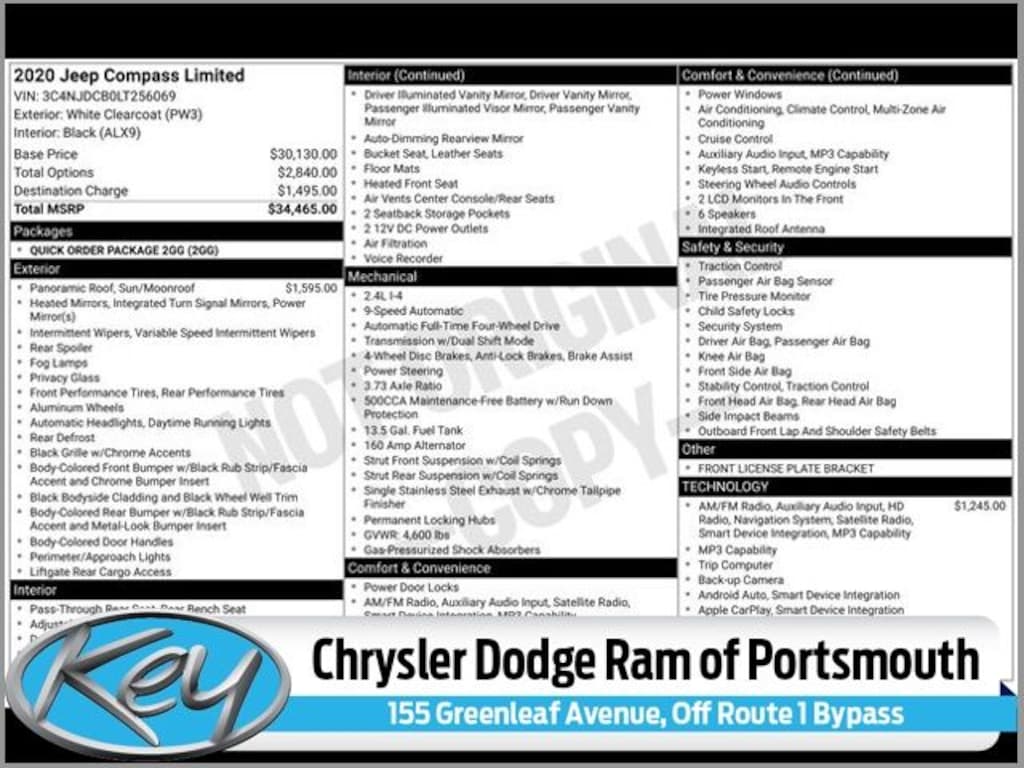 Key Chrysler Dodge Ram of Portsmouth is proud to present you with another True Market Priced Pre-Owned Vehicle. Transparent Pricing Of $ 17499 !! This 2020 Jeep Compass Limited is loaded with the following Factory Options: 4WD Quick Order Package 2GG, 4WD, 1-Year SiriusXM Guardian Trial, 2nd Row USB Type A, 3.73 Axle Ratio, 4-Wheel Disc Brakes, 5-Year SiriusXM Traffic Service, 5-Year SiriusXM Travel Link Service, 6 Speakers, 8.4" Touch Screen Display, ABS brakes, Air Conditioning, Air Vents Center Console/Rear Seats, Alloy wheels, AM/FM radio: SiriusXM, Anti-whiplash front head restraints, Apple CarPlay, Apple CarPlay/Android Auto, Auto-dimming Rear-View mirror, Automatic temperature control, Autostick Automatic Transmission, Bluetooth Integrated Voice Command, Bluetooth® Streaming Audio, Brake assist, Bumpers: body-color, Compass, Delay-off headlights, Driver door bin, Driver vanity mirror, Dual front impact airbags, Dual front side impact airbags, Electronic Stability Control, For Details, Visit DriveUconnect.com, Four wheel independent suspension, Front anti-roll bar, Front Bucket Seats, Front Center Armrest w/Storage, Front dual zone A/C, Front fog lights, Front License Plate Bracket, Front reading lights, Fully automatic headlights, Google Android Auto, GPS Antenna Input, GPS Navigation, HD Radio, Heated door mirrors, Heated front seats, Heated steering wheel, Illuminated entry, Knee airbag, Leather Shift Knob, Leather Trimmed Bucket Seats, Leather Wrapped Shift Knob, Low tire pressure warning, Media Hub (USB, AUX), Occupant sensing airbag, Outside temperature display, Overhead airbag, Overhead console, Panic alarm, ParkView Rear Back-Up Camera, Passenger door bin, Passenger vanity mirror, Power door mirrors, Power driver seat, Power Front/Fixed Rear Full Sunroof, Power steering, Power windows, Radio: Uconnect 4 w/8.4" Display, Radio: Uconnect 4C Nav w/8.4" Display, Rear anti-roll bar, Rear seat center armrest, Rear window defroster, Rear window wiper, Remote keyless entry, Roof rack: rails only, Security system, SiriusXM Traffic Plus, SiriusXM Travel Link, Speed control, Split folding rear seat, Spoiler, Steering wheel mounted audio controls, Tachometer, Telescoping steering wheel, Tilt steering wheel, Traction control, Trip computer, Turn signal indicator mirrors, USB Host Flip, Variably intermittent wipers, and Wheels: 18" x 7.0" Polished/Gray Pockets Aluminum!!