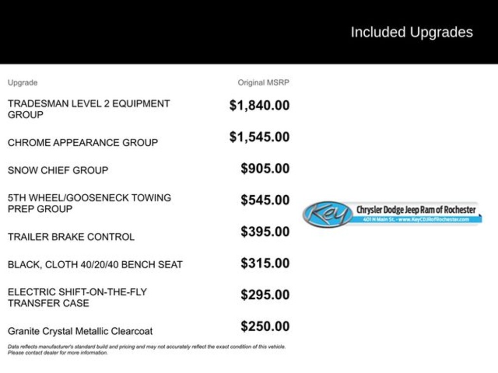 Key Chrysler Dodge Jeep Ram of Rochester is proud to present you with another True Market Priced Pre-Owned Vehicle. Transparent Pricing Of $ 39995 !! This 2022 Ram 2500 Tradesman is loaded with the following Factory Options: Chrome Appearance Group (Bright Front Bumper, Bright Rear Bumper, Center Hub, Chrome Grille Surround, Matte Black Mesh Grille w/Chrome, and Wheels: 18" x 8.0" Steel Chrome Clad), Quick Order Package 2GA Tradesman, Snow Chief Group (220 Amp Alternator, Anti-Spin Differential Rear Axle, Clearance Lamps, Dash Pass Thru Wire Circuits, and I/P Mounted Auxiliary Switches), Tradesman Level 2 Equipment Group (2 Way Rear Headrest Seat, 4 Way Front Headrests, 40/20/40 Split Bench Seat, Carpet Floor Covering, Cloth 40/20/40 Bench Seat, Front Armrest w/Cupholders, Manual Adjust 4-Way Driver Seat, Manual Adjust 4-Way Front Passenger Seat, Rear Folding Seat, Rear Power Sliding Window, Rear Window Defroster, SiriusXM Satellite Radio, and Storage Tray), 17" x 7.5" Steel Styled Wheels, 3.73 Axle Ratio, 4-Wheel Disc Brakes, 5th Wheel/Gooseneck Towing Prep Group, 6 Speakers, ABS brakes, Active Noise Control System, Air Conditioning, AM/FM radio, Black Exterior Mirrors, Brake assist, Compass, Delay-off headlights, Driver door bin, Dual front impact airbags, Dual front side impact airbags, Electric Shift-On-The-Fly Transfer Case, Electronic Stability Control, Electronically Controlled Throttle, Emergency communication system: SiriusXM Guardian, Exterior Mirrors Courtesy Lamps, Exterior Mirrors w/Heating Element, Exterior Mirrors w/Supplemental Signals, Front anti-roll bar, Front Center Armrest w/Storage, Front License Plate Bracket, Front reading lights, Fully automatic headlights, Global Telematics Box Module (TBM), GPS Antenna Input, Heated door mirrors, Heavy Duty Vinyl 40/20/40 Split Bench Seat, Illuminated entry, Integrated Voice Command w/Bluetooth, Low tire pressure warning, Mirror Running Lights, MOPAR Front & Rear Rubber Floor Mats, Occupant sensing airbag, Outside temperature display, Overhead airbag, Overhead console, ParkView Rear Back-Up Camera, Passenger door bin, Passenger vanity mirror, Power Adjust & Heated Black Tow Mirrors, Power door mirrors, Power steering, Power windows, Radio data system, Radio: Uconnect 3 w/5" Display, Rear anti-roll bar, Rear step bumper, Rear Wheelhouse Liners, Selectable Tire Fill Alert, SiriusXM Radio Service, Speed control, Tachometer, Tilt steering wheel, Tip Start, Traction control, Trailer Brake Control, Trailer Light Check, Trailer Tow Mirrors, Variably intermittent wipers, Vendor Painted Cargo Box, Vendor Painted Cargo Box Tracking, and Voltmeter!!